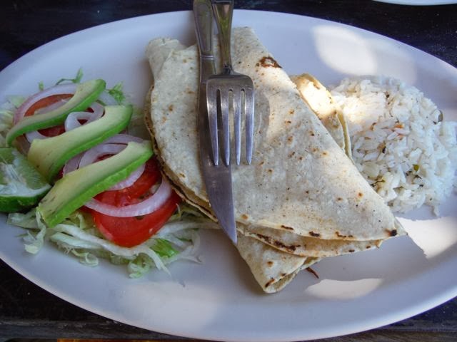 Tacos erhält man mit allen verschiedenen Füllungen: verschiedenes Fleisch (von Carnitas – kleingeschnittene Schweine-Innereien – bis zu feinstem Bistek), Gemüse, Fisch oder vegetarisch. Die Zugaben werden in Tortillas (Maisfladen) gestrichen, mit Saucen verfeinert und genossen. Quesadillas (im Bild) sind Tacos mit geschmolzenem Käse.